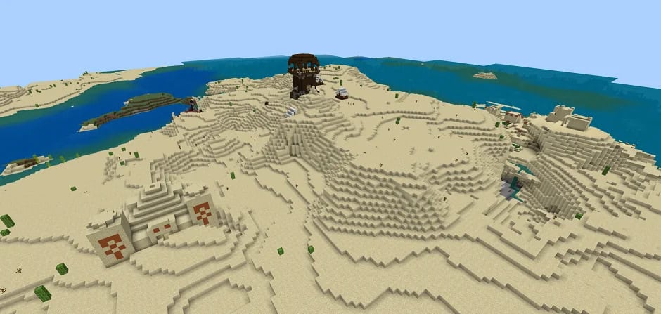 Un reto de supervivencia desde el inicio. Un enorme desierto rodeado de océanos, con pocos recursos iniciales, pero recompensado con templos, aldeas y naufragios.